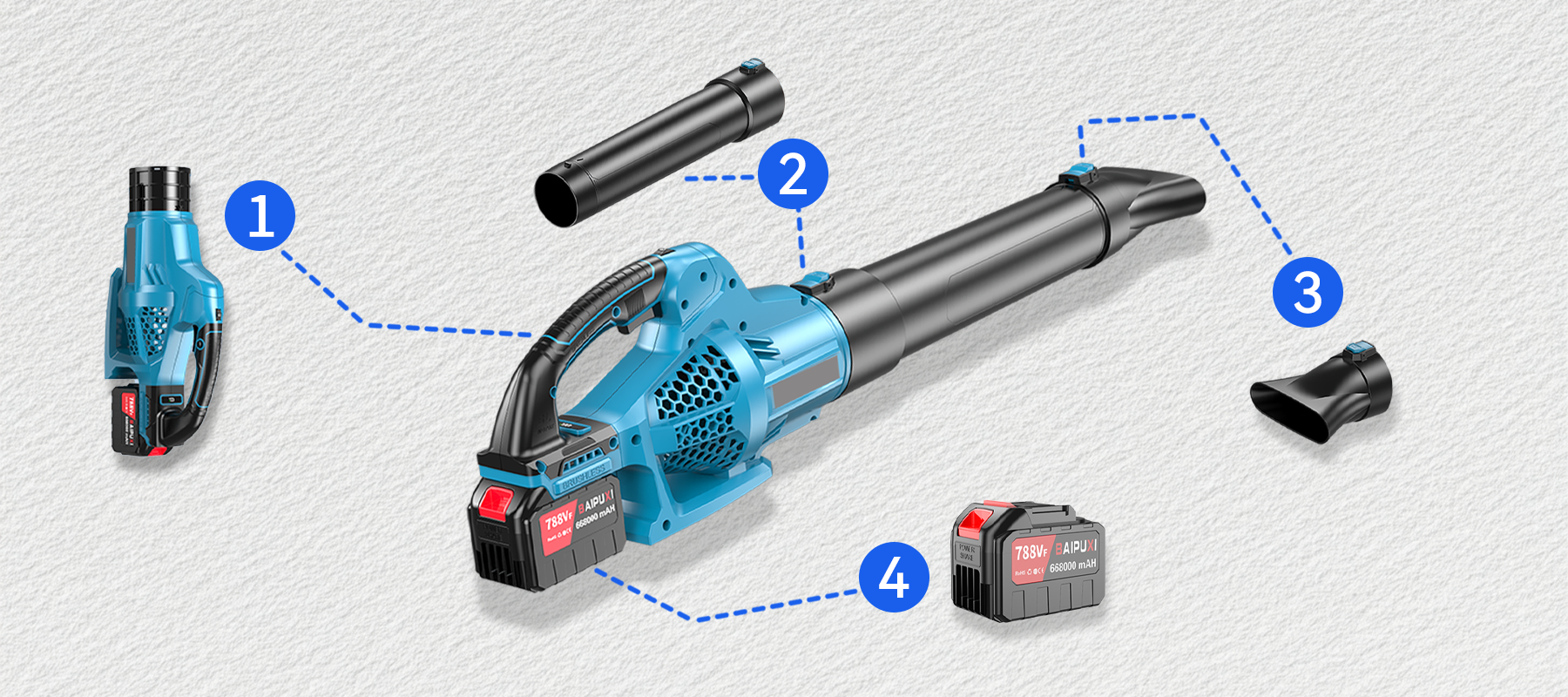 Equipped with turbo boost technology, the Wavel Cordless Electric Leaf Blower instantly compresses and blasts out air at high speed, creating a powerful force. This surge of power lets you effortlessly blow away stubborn leaves and dust, making cleanup both efficient and effective.